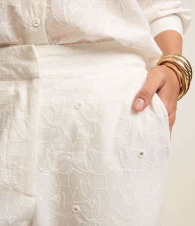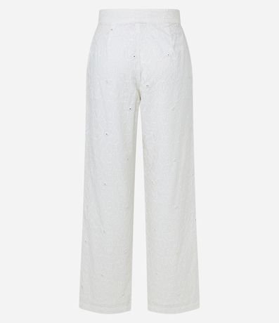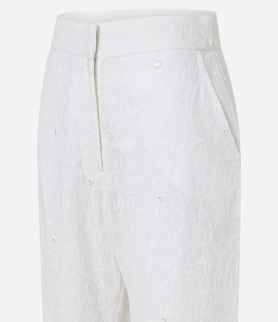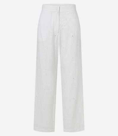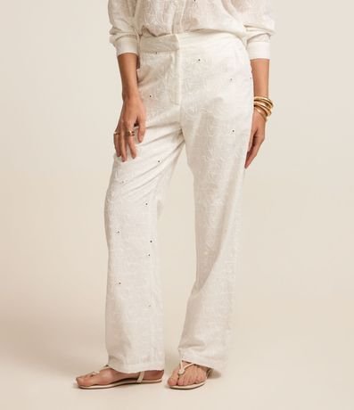 Ref: Calça reta de cintura alta e cós alfaiatado confeccionado em laise com bolsos frontais e bordados pelo tecido.