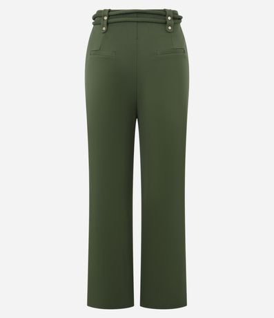 Calça reta de cintura alta, toda confeccionada em viscose mais sustentável, com passantes com botões na cintura além de fechamento tradicional. A roupa tem cinto duplo de tecido mais recortes dianteiros que tem aspecto de bolsos.