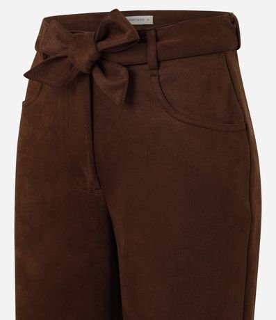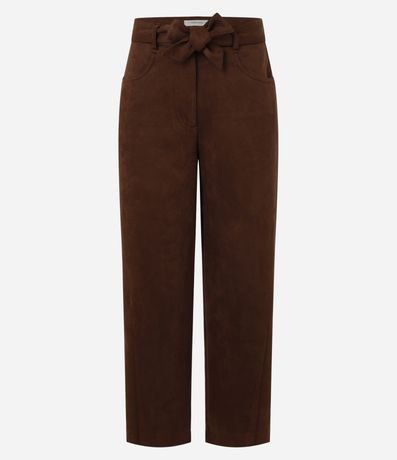 Calça reta de cintura alta, confeccionada em suede com passantes no cós, fechamento tradicional e bolsos. Conta com cinto de tecido para amarração na cintura.
