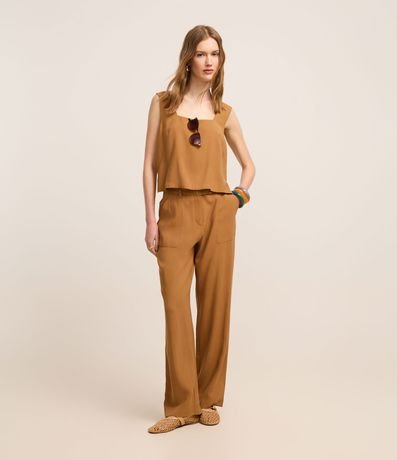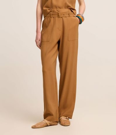 Ref: Calça reta de cintura alta, confeccionada em viscose, com passantes no cós, bolsos frontais e pences atrás. Peça tem cinto com fivela. Este produto possui viscose certificada em sua composição, além de ter sido produzido através de processos mais sustentáveis com boas práticas ambientais, sendo ambientalmente mais responsável.