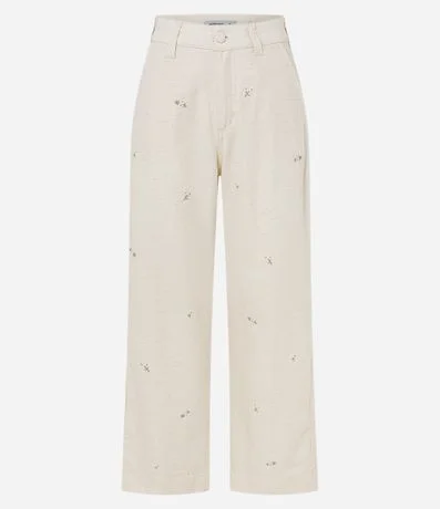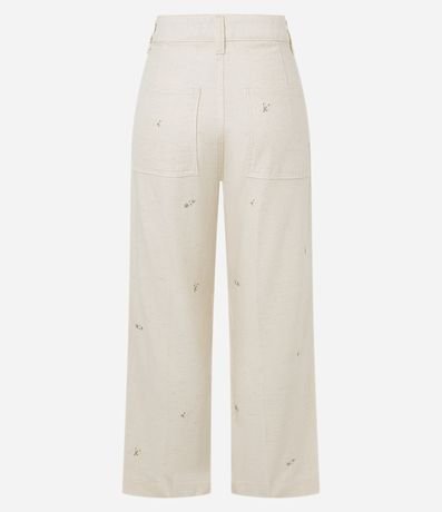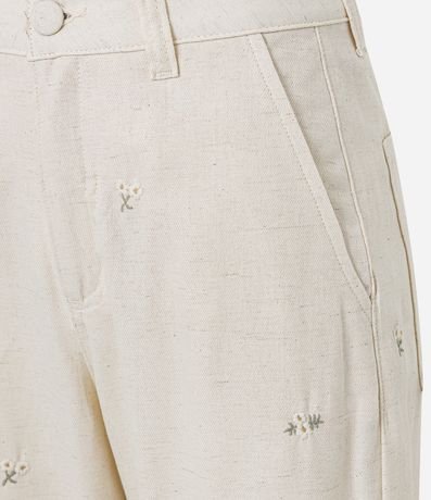 Calça reta cropped, confeccionada em algodão com 02% de linho, com passantes no cós, fechamento tradicional, bolsos e bordados florais. Este produto possui algodão certificado em sua composição, sendo ambientalmente mais responsável.