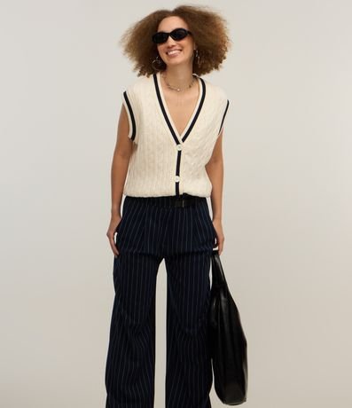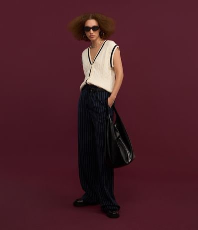 Ref: Calça reta em alfaiataria, cós alto com meio cinto frontal e com pregas.