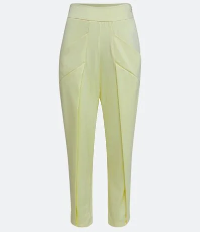 Calça reta em alfaiataria com detalhe de dobradura e sem estampa.