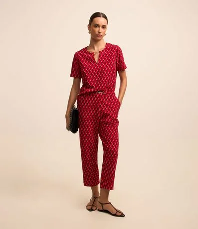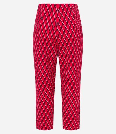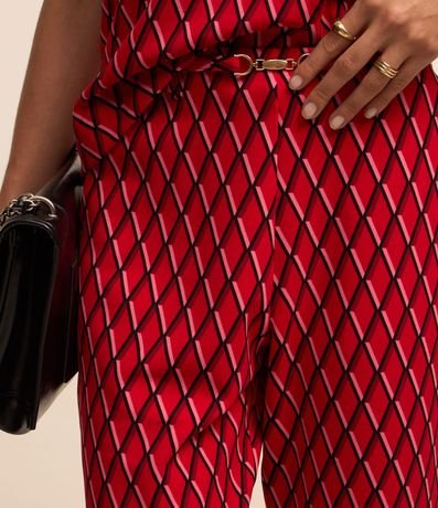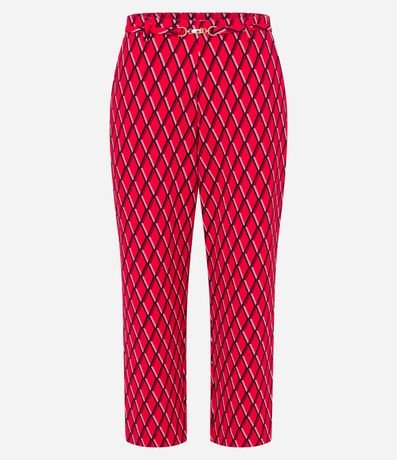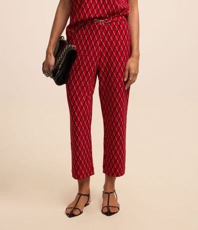 Ref: Calça reta feminina, confeccionada em crepe, com detalhe metálico no cós e estampa geométrica.