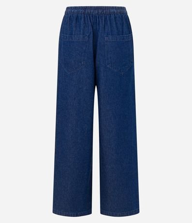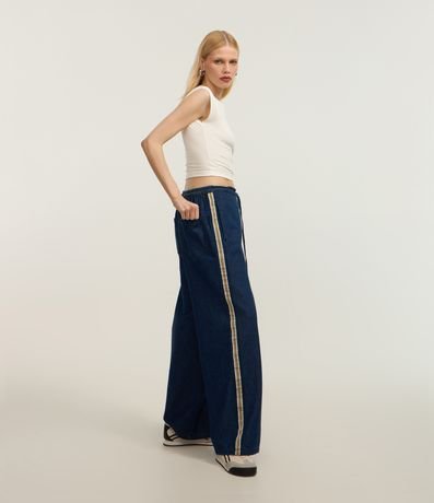 Ref: Calça reta, em jeans, confeccionada em algodão mais sustentável. Possui cós elástico com amarração e detalhe lateral em viés contrastante aplicado.