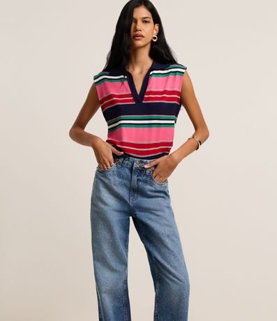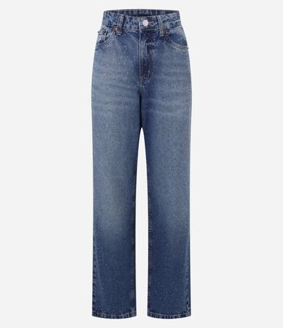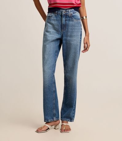 Ref: Calça reta confeccionada em jeans com algodão bci mais sustentável, cintura alta e brilhos aplicados na parte frontal.