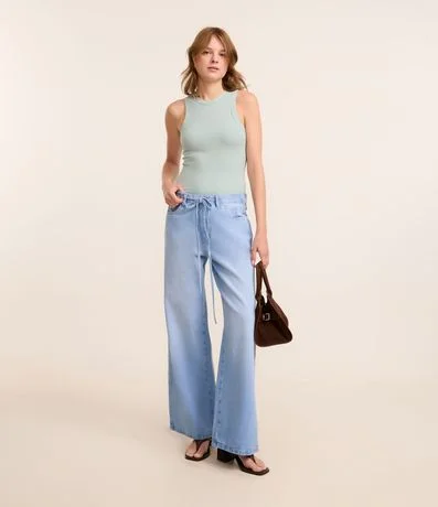 Calça feminina confeccionada em jeans mais sustentável com boas práticas ambientais, peça no modelo reta, cós com passante, cinto de amarração, fechamento tradicional e bolsos.