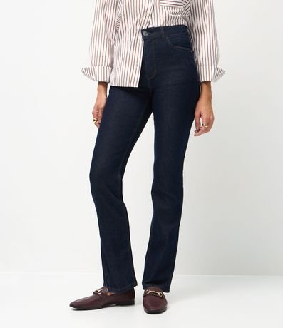 Calça reta jeans com cintura média, cós com passantes, bolsos e sem estampa.