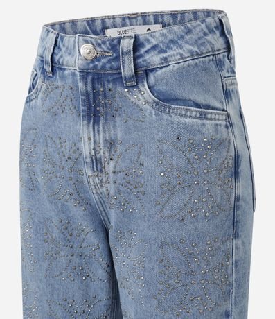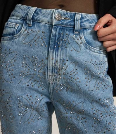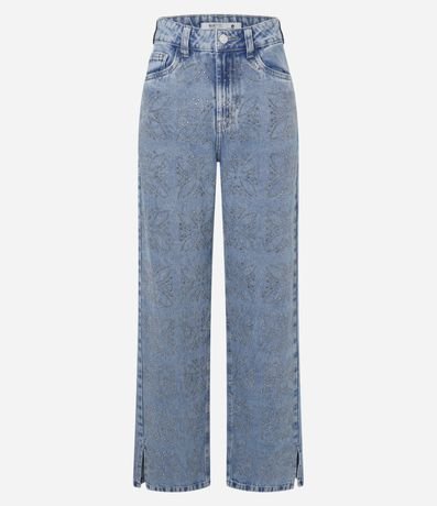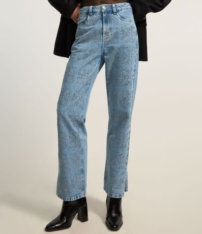 Calça Reta em Jeans com Flores de Brilhos Aplicados