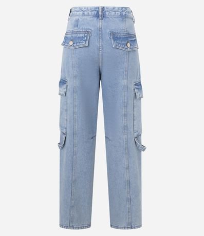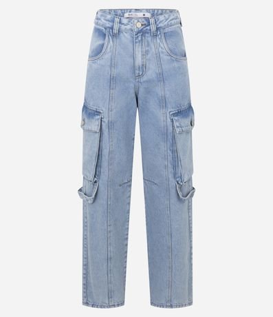 Ref: Calça reta, confeccionado em jeans mais sustentável, cós com passantes e bolsos cargo nas laterais.