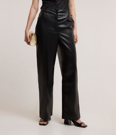Ref: Calça feminina confeccionada em material sintético, de modelo reta e com cós alfaiatado. Possui fechamento frontal e detalhe de friso frontal.