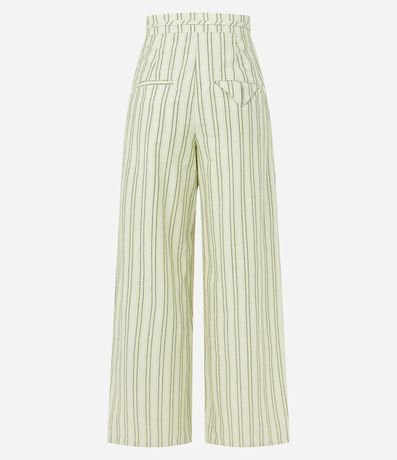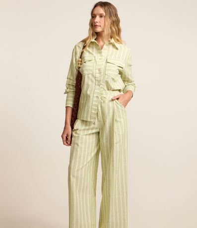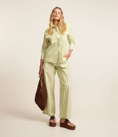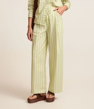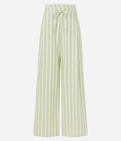 Ref: Calça reta com cordão no cós, cintura alta, confeccionada em sarja e com listras.