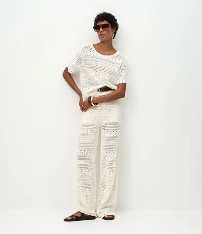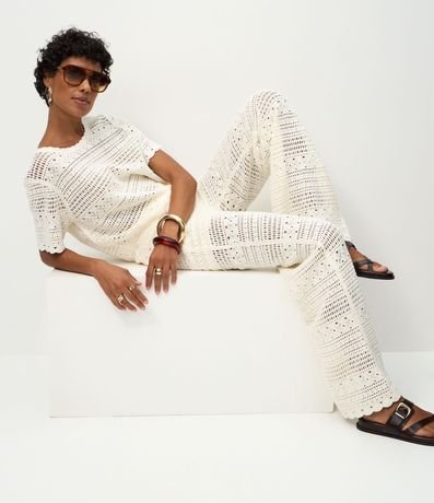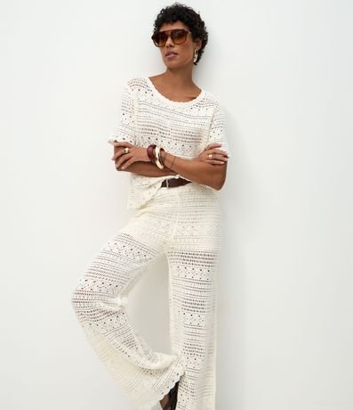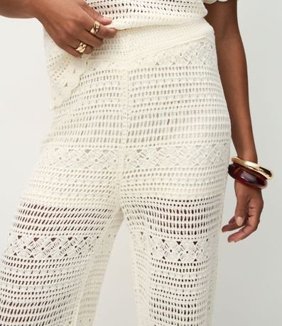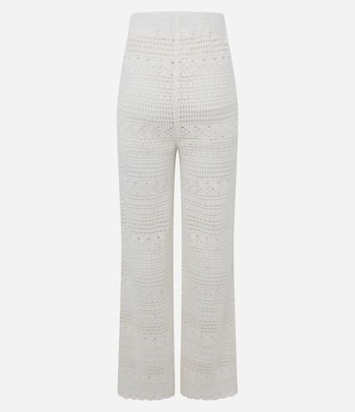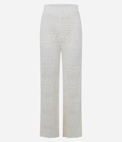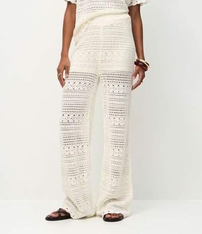 Ref: Calça reta feminina em tricô com trama aberta em desenhos geométricos, criando efeito artesanal. Peça confortável, moderna e perfeita para compor looks diferenciados.