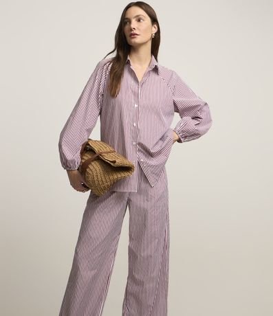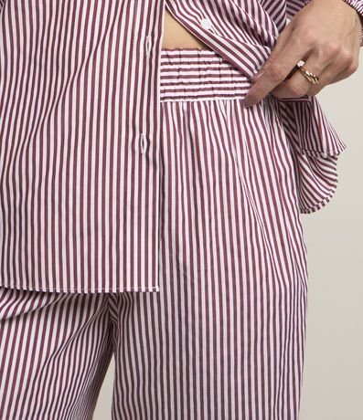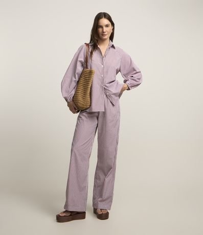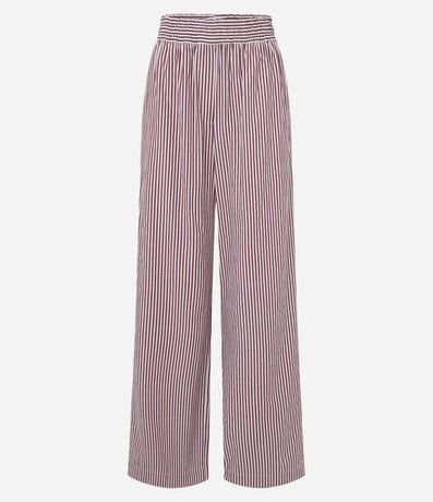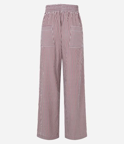 Calça feminina confeccionada em tricoline, de modelo reta, com cós largo, bolsos e estampa listrada.
