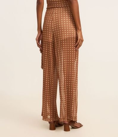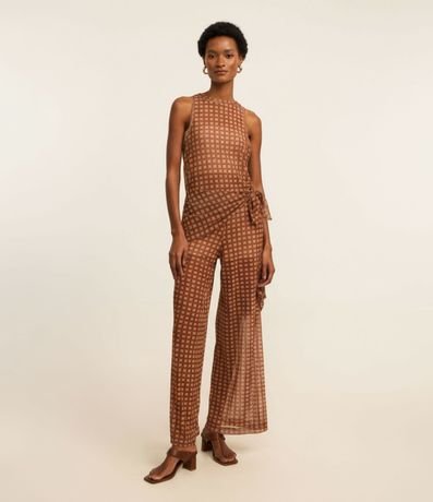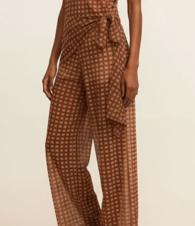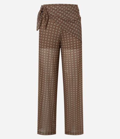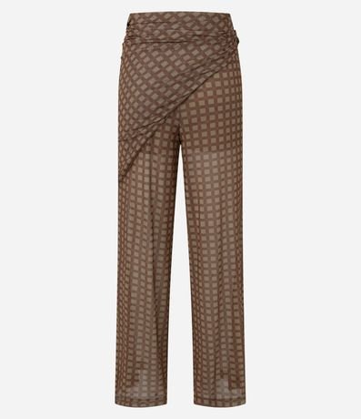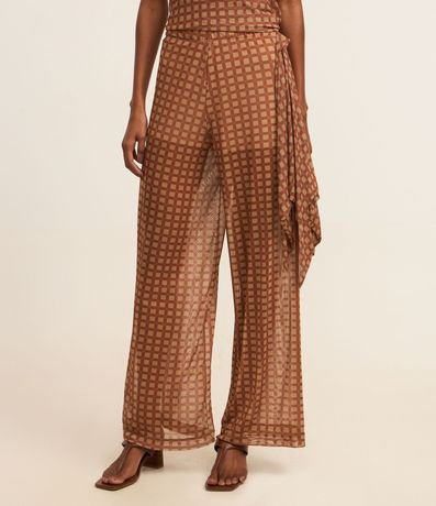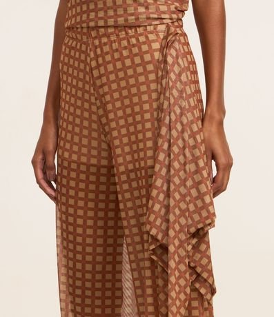 Calça feminina confeccionada em tule com cós elástico, no modelo reta com forro, transparência, estampa quadriculada e detalhe de lenço lateral.