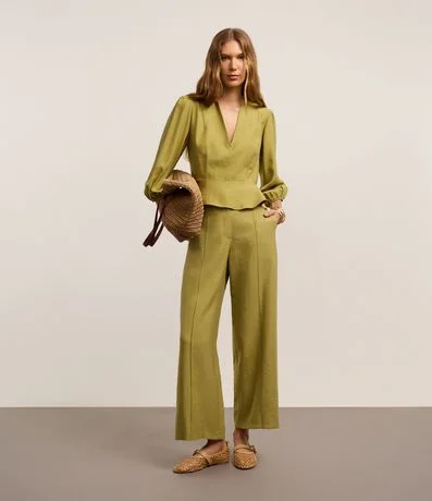 Ref: Calça reta confeccionada em crepe texturizado com botões duplos e fechamento tradicional, além de bolsos e frisos frontais. Este produto foi fabricado através de processos mais sustentáveis, adotando boas práticas ambientais.