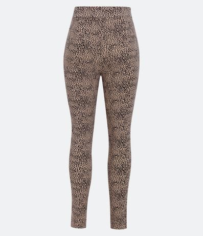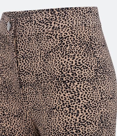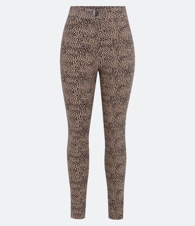 Calça em bengaline modelo skinny, com cintura alta, cós com botão metálico contrastante e estampa animal print de oncinha.