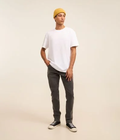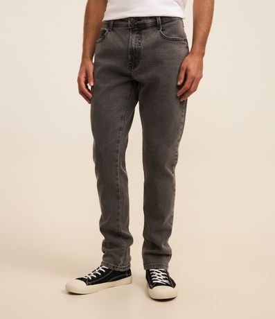 Calça masculina confeccionada em jeans com elastano. Peça no modelo skinny com fechamento tradicional e bolsos.