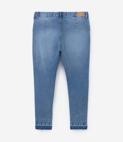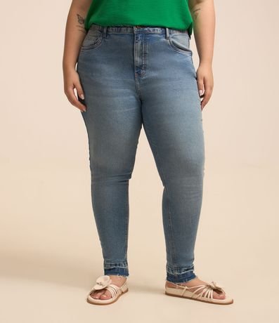 Ref: Calça jeans feminina de modelo skinny, plus size, com cintura média e detalhe de barra desfeita. Possui passantes no cós, bolsos e lavagem de efeito dirty.