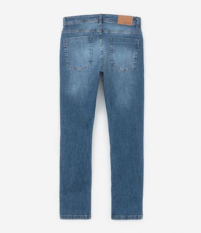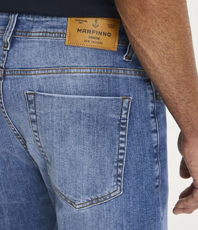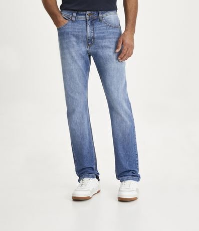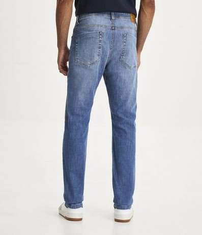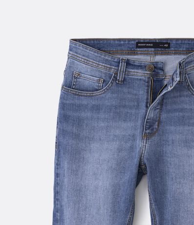 Calça jeans masculina com elastano, modelo slim, básica, com fechamento por botão e zíper, bolsos e sem estampa.