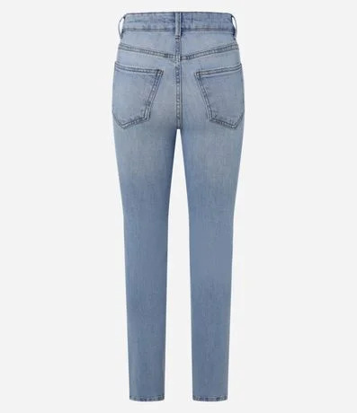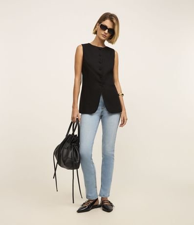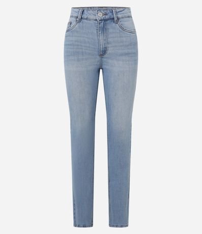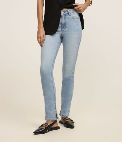 Ref: Calça jeans feminina, modelo slim, com cintura média, passantes no cós, bolsos e fenda na barra.