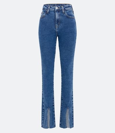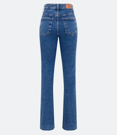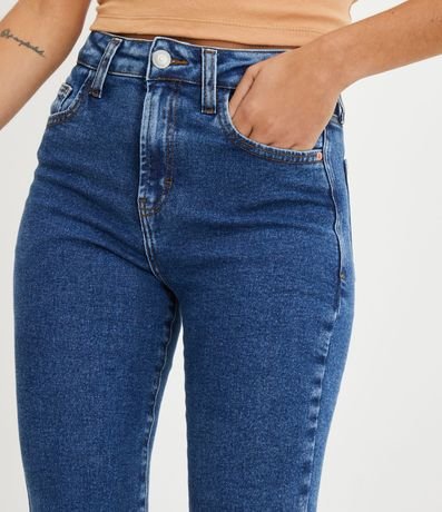 Ref: Calça boca de sino em jeans cintura alta e bolsos além de fendinhas frontais nas barras.