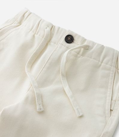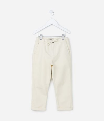 Calça infantil de modelo slim, com amarração no cós, bolsos, barra dobrada. Confeccionada em sarja.
