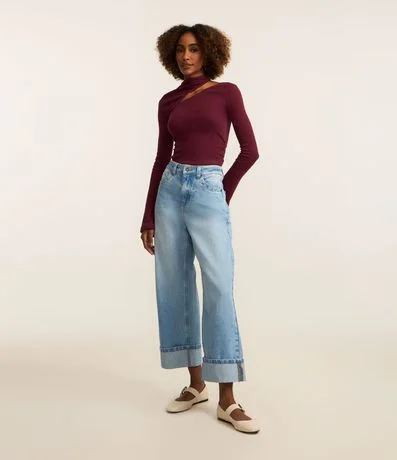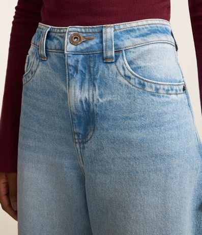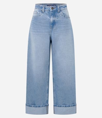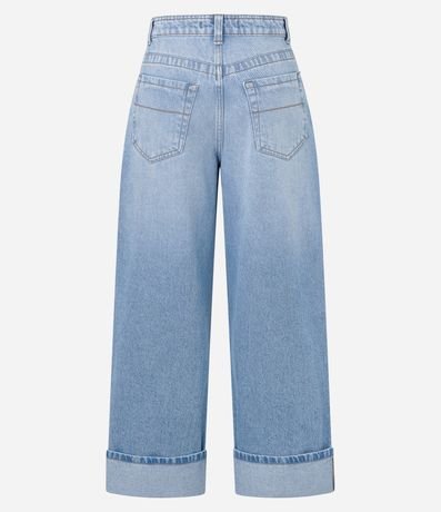 Ref: Calça slouchy com cintura alta, confeccionada em jeans com algodão bci mais sustentável, bolsos e detalhe na barra larga dobrada.