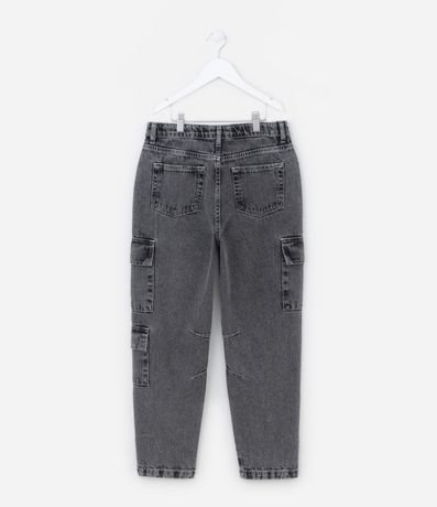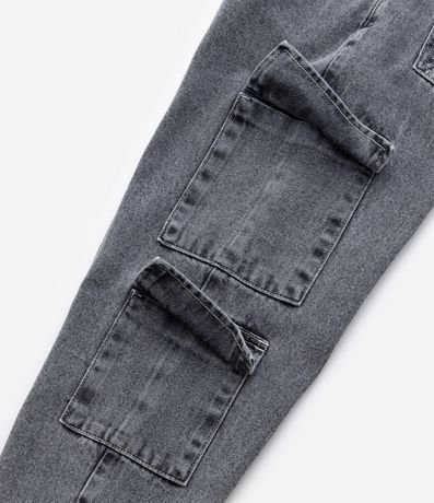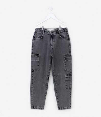 Ref: Calça infantil confeccionada em jeans, de modelo slouchy, com passantes no cós e bolsos cargo nas laterais. Possui fechamento frontal tradicional com botão e zíper.