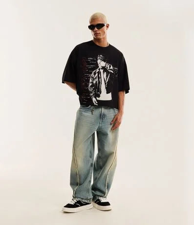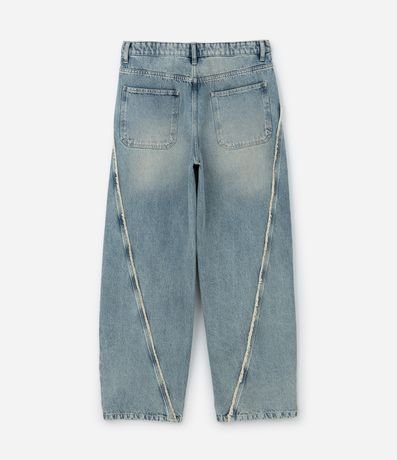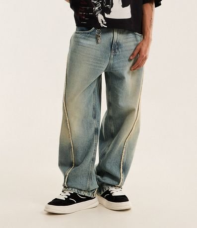 Calça masculina confeccionada em jeans mais sustentável com boas práticas ambientais, no modelo super baggy. Possui cós com passante, fechamento tradicional, bolsos e detalhes desfiados.