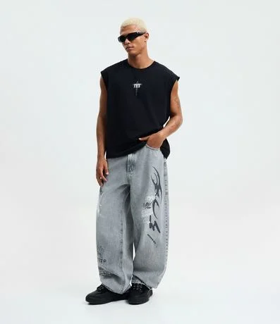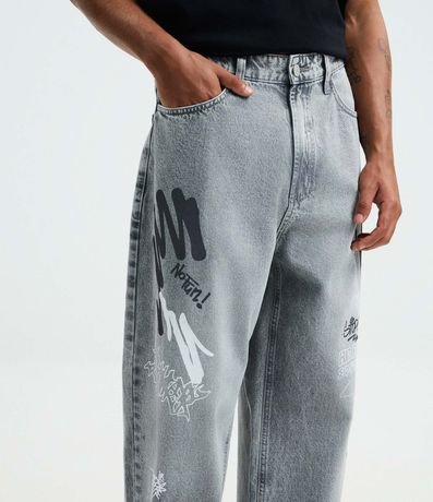 Ref: Calça masculina confeccionada em jeans mais sustentável, no modelo super baggy, possui cós com passante, fechamento tradicional, bolsos e estampa de grafite.