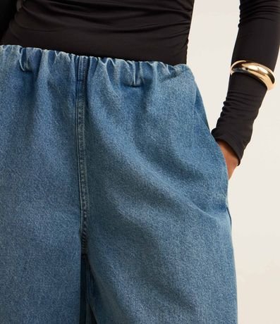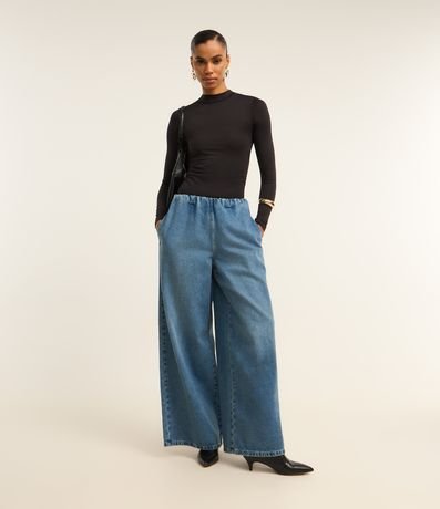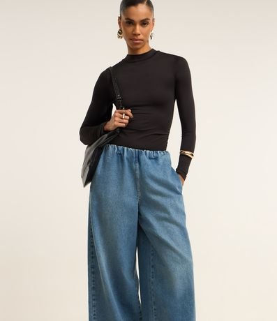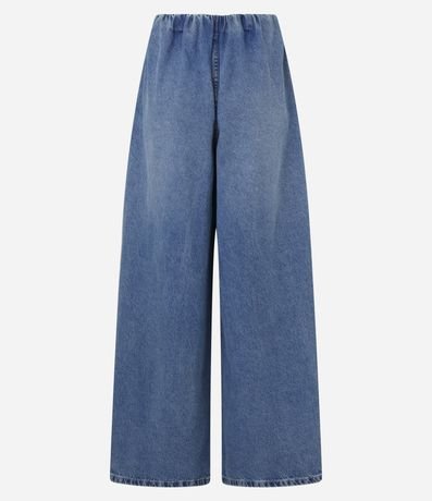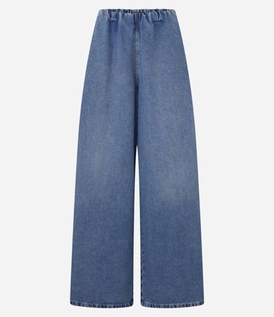 Ref: Calça super wide com cós drapeado, confeccionada em jeans cxom algodão bci mais sustentável e elástico interno.