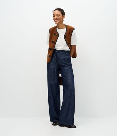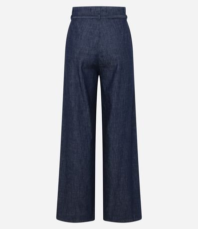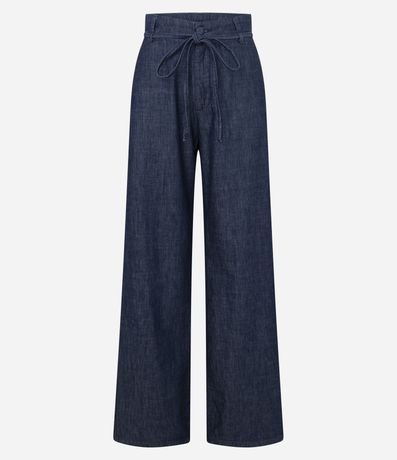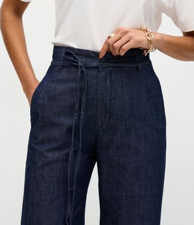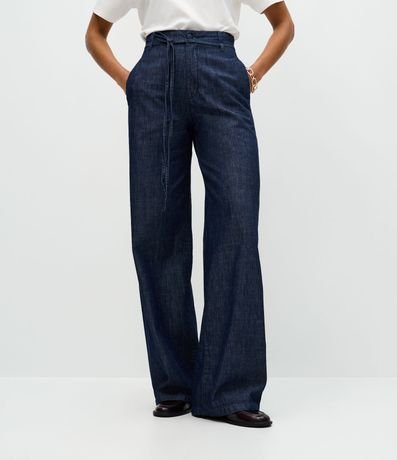 Ref: Calça wide confeccionada em jeans blue escuro, com cintura alta e cinto de amarração no mesmo tecido que valoriza a silhueta. Possui fechamento frontal tradicional e caimento amplo e elegante. Confeccionada em algodão certificado BCI para maior conforto.