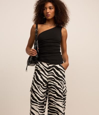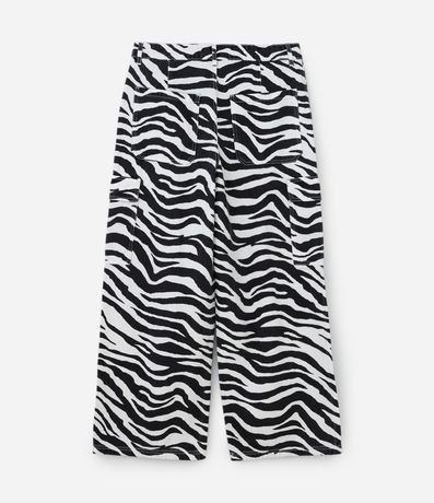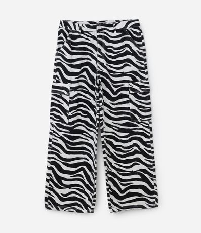 Ref: Calça feminina modelo wide confeccionada em sarja, cós com passante, fechamento tradicional, bolsos cargo laterais. Peça com estampa animal print.