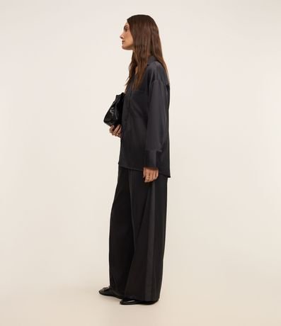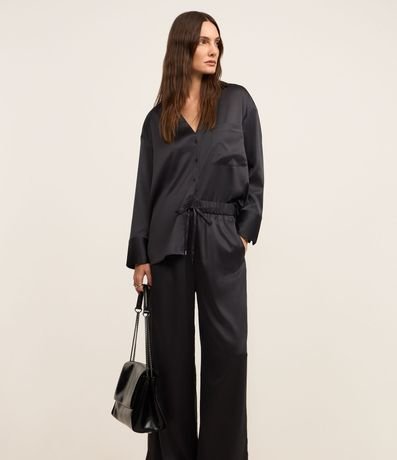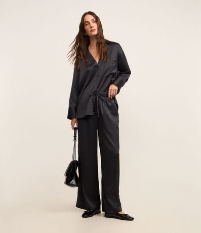 Ref: Calça wide leg de cintura alta, confeccionada em tecido com efeito acetinado, com elástico e amarração na cintura. Peça tem caimento leve.