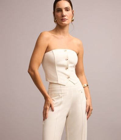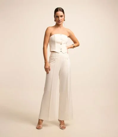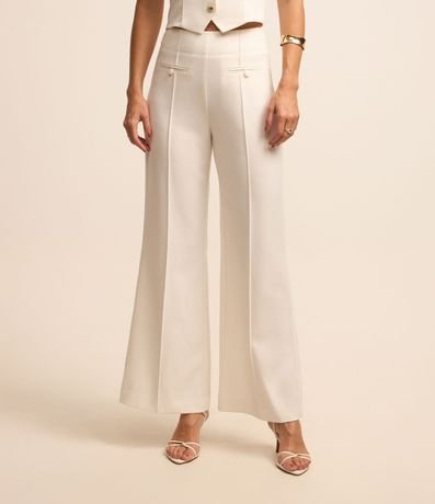 Calça wide leg alfaiatada de cintura alta com bolsos frontais com botões, frisos verticais frontais e pences dianteiros próximos da cintura.