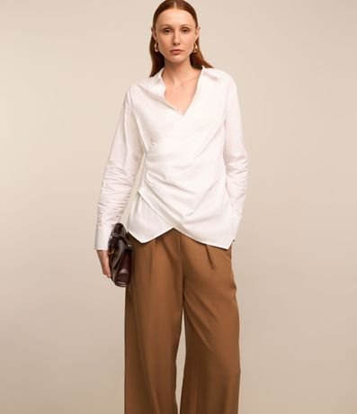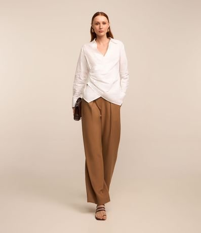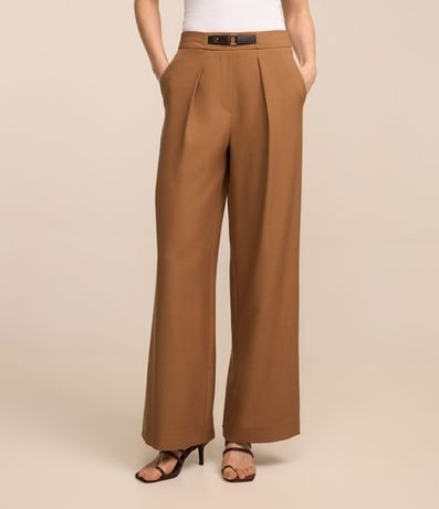 Ref: Calça wide leg feminina alfaiatada, com cinto fivela, pregas e superfície sem estampa.