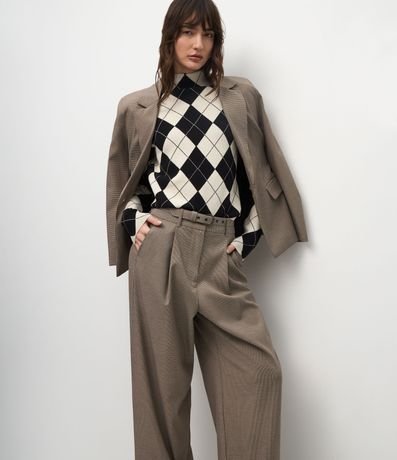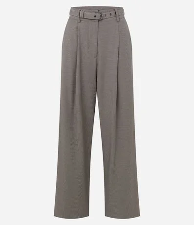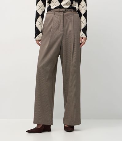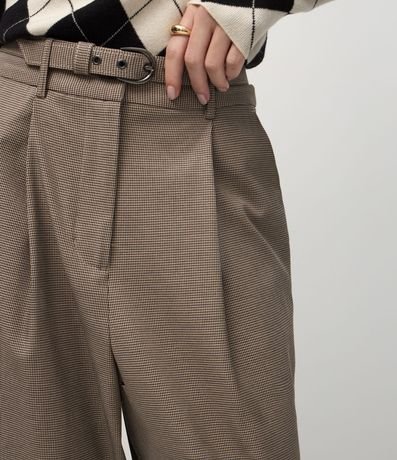 Ref: Calça feminina de alfaiataria com estampa pied de poule e modelagem wide leg. Possui cós alto com passantes, cinto encapado com fivela delicada.