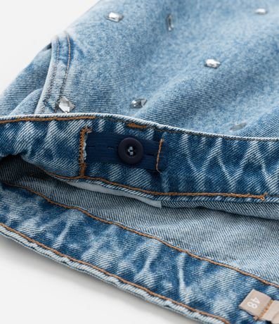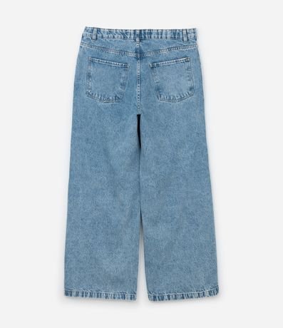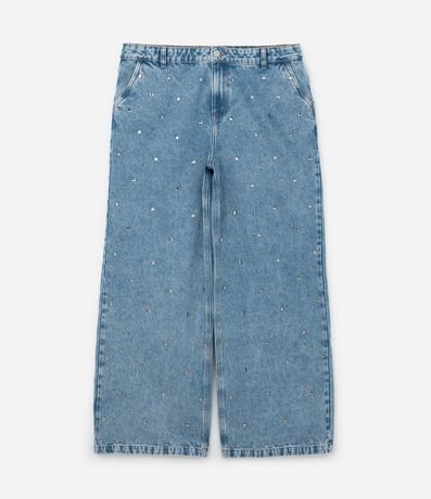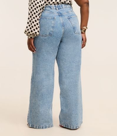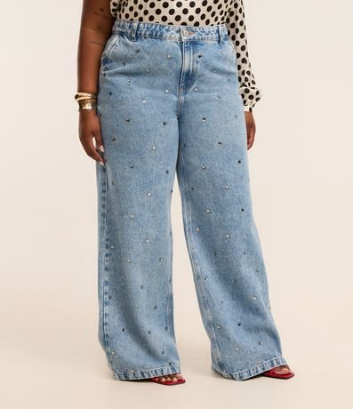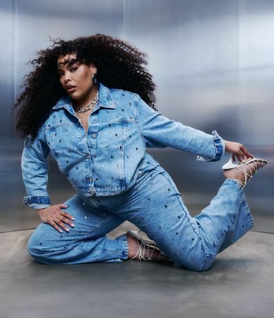 Ref: Calça feminina Curve & Plus Size confeccionada em jeans mais sustentável com boas práticas ambientais, peça com efeito marmorizado no modelo wide leg com botão interno para ajuste, cós com passantes, fechamento tradicional e aplicação de brilhos. Peça em parceria com a modelo Rita Carreira.