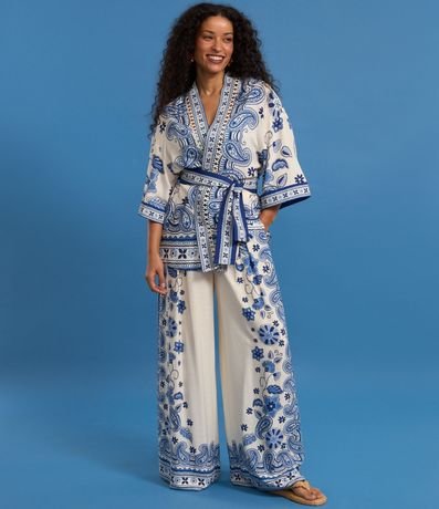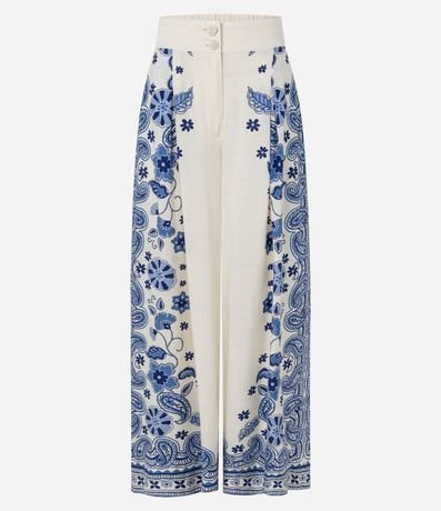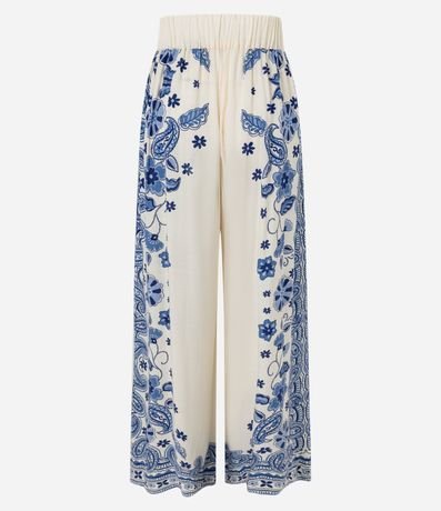 Ref: Calça feminina de modelo wide leg, confeccionada em viscose certificada. Possui cintura alta, com elástico nas costas, fechamento por botões com miçangas e estampa lateral de arabescos.