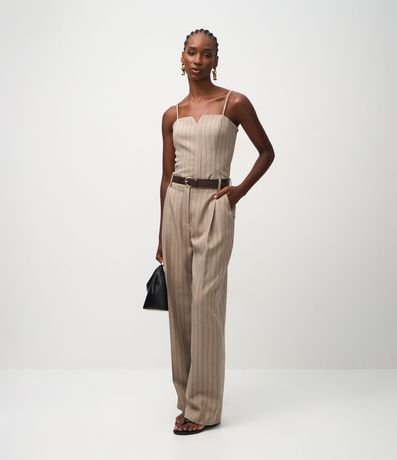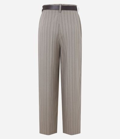 Calça de alfaiataria com modelagem wide leg, listras verticais. Possui cós liso com passantes e acompanha cinto em material sintético com fivela de metal.
