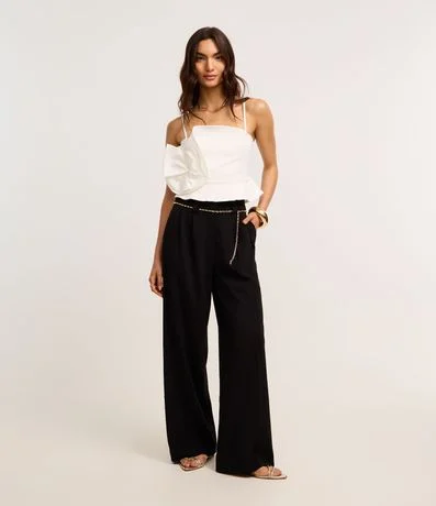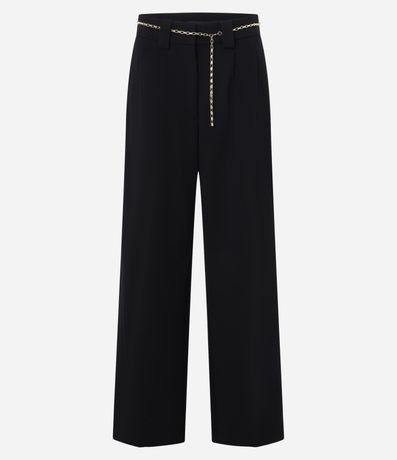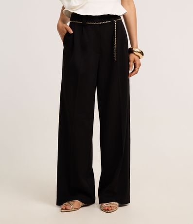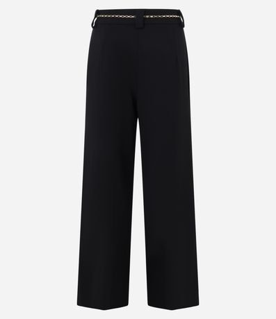 Calça wide leg, confeccionado em crepe, com passantes no cós, fechamento tradicional, pregas e cinto de correntinha.