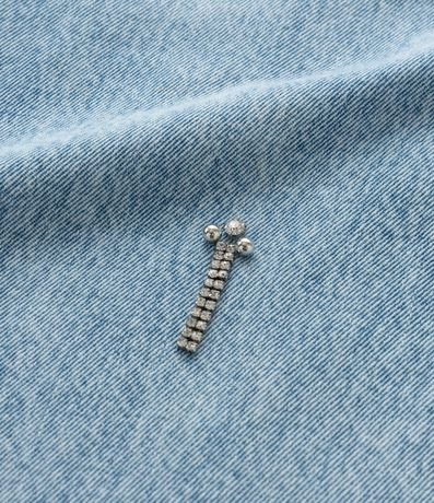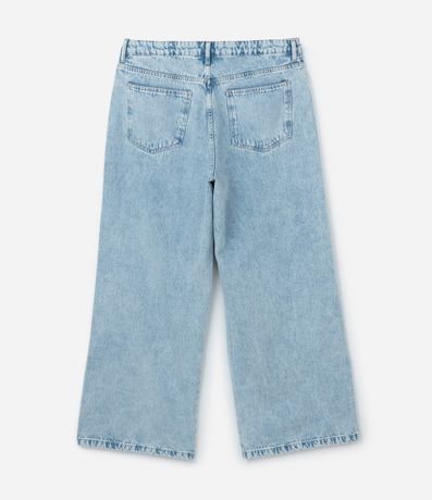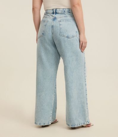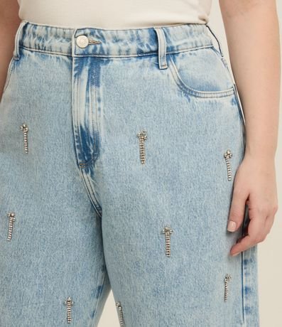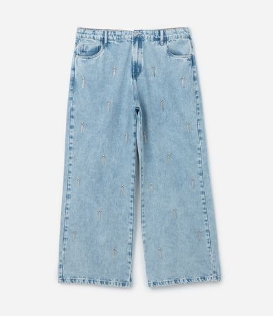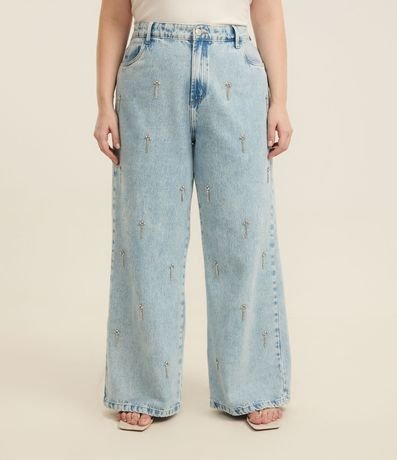 Ref: Calça feminina Curve & Plus Size confeccionada em jeans de algodão certificado bci com cós fixo, passantes, fechamento tradicional. Peça no modelo wide leg, com efeito marmorizado e aplicação de strass.