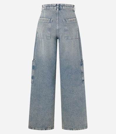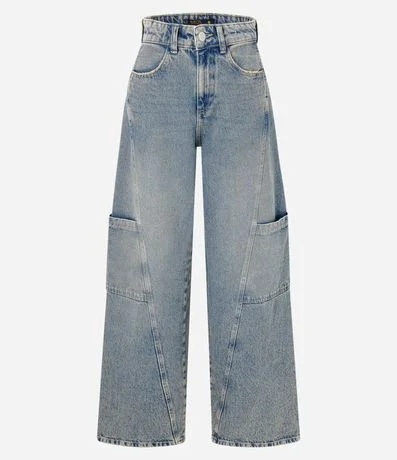 Ref: Calça wide leg com cintura alta, confeccionada em jeans, recorte frontal e com bolsos grandes na lateral.
