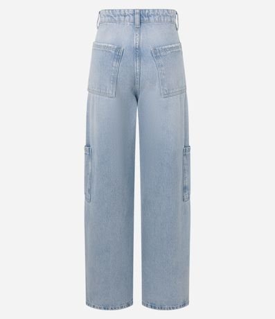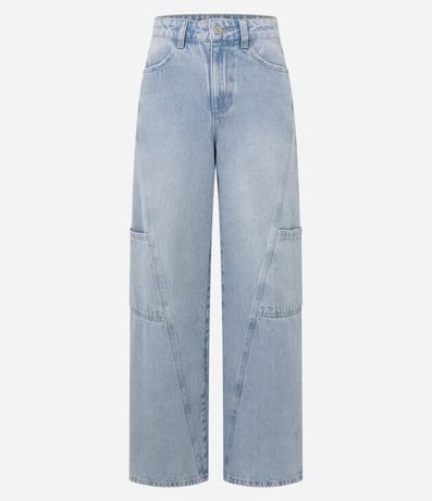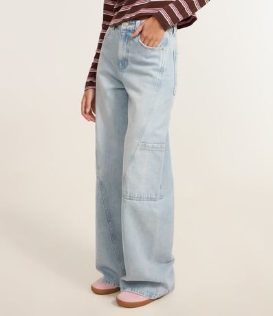 Ref: Calça wide leg com cintura alta, confeccionada em jeans, recorte frontal e com bolsos grandes na lateral.