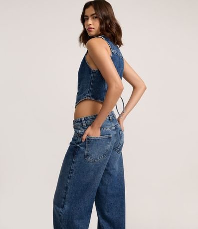Calça wide leg de cintura média, confeccionada em jeans, com passantes no cós transpassado, fechamento tradicional e bolsos. Este produto possui material mais sustentável em sua composição, sendo ambientalmente mais responsável.