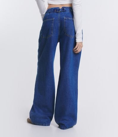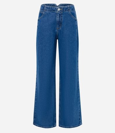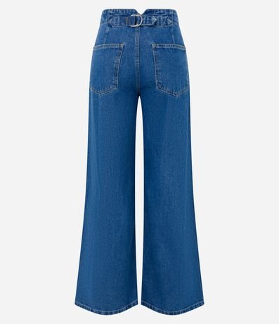 Ref: Calça wide leg confeccionada em jeans com detalhe V na parte dianteira do cós mais faixa com fivela e bolsos com pences logo abaixo.