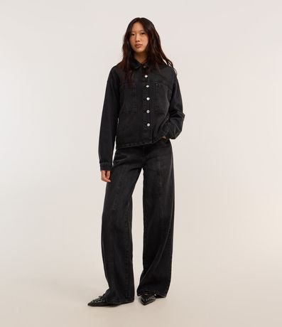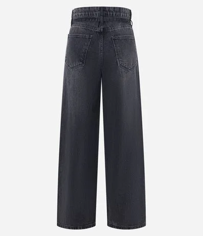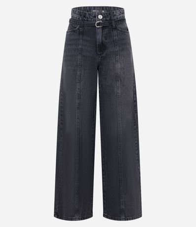 Ref: Calça wide leg com cinto e fivela em metal, passantes no cós, confeccionada em jeans com boas práticas ambientais e friso frontal.