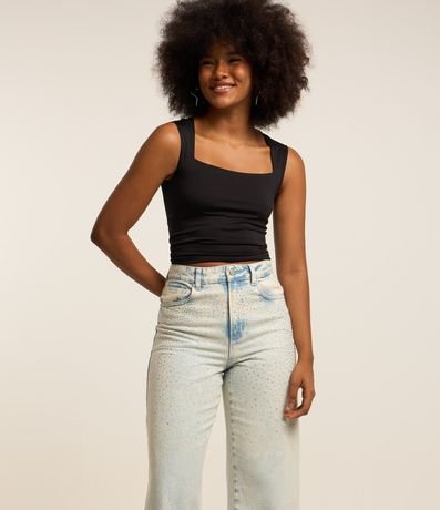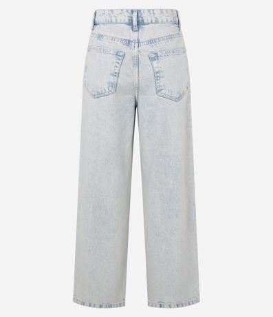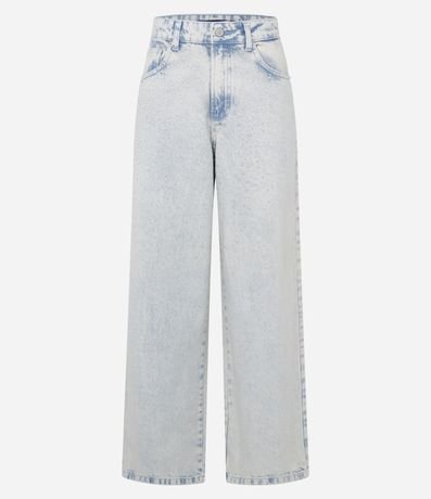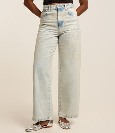 Calça wide leg, confeccionada em jeans, delavê com passantes no cós e brilhos aplicados.