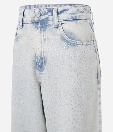 Calça Wide Leg em Jeans Delavê com Brilhos Aplicados